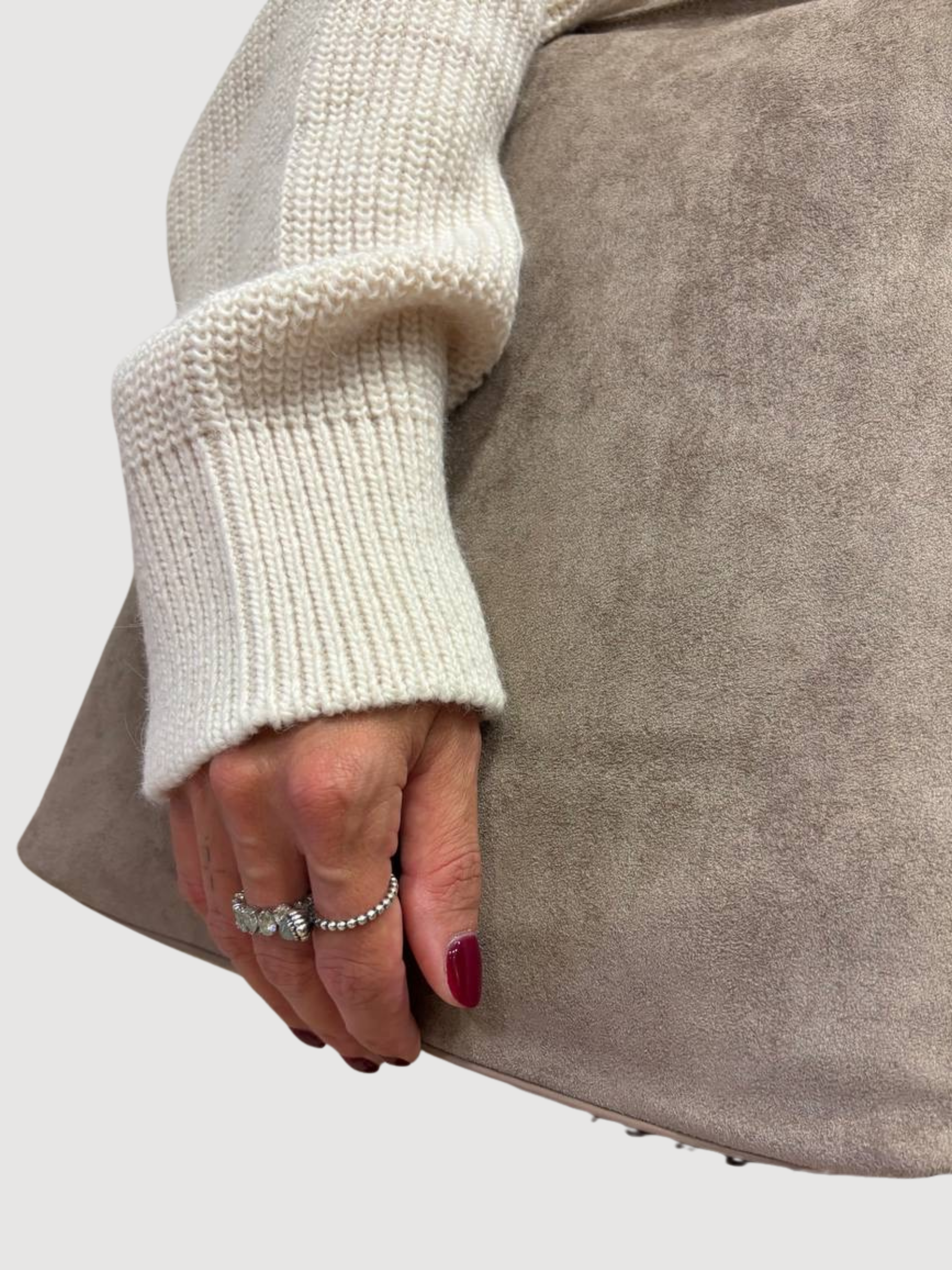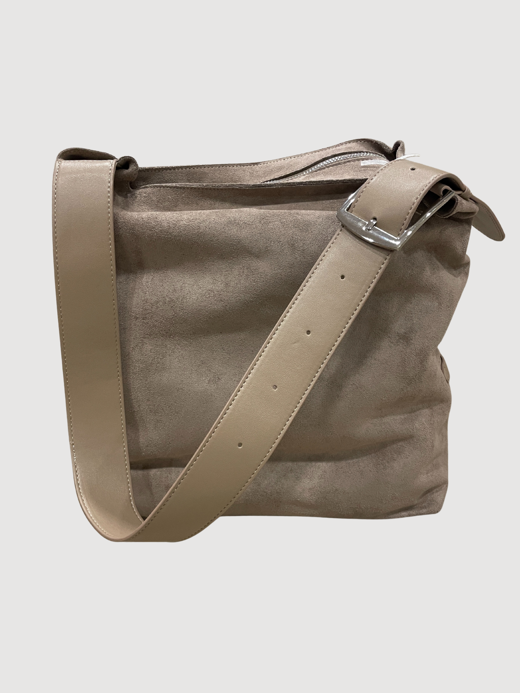 Borsa in suede gesso con pochette all'interno. Disponibile in beige e fondente.