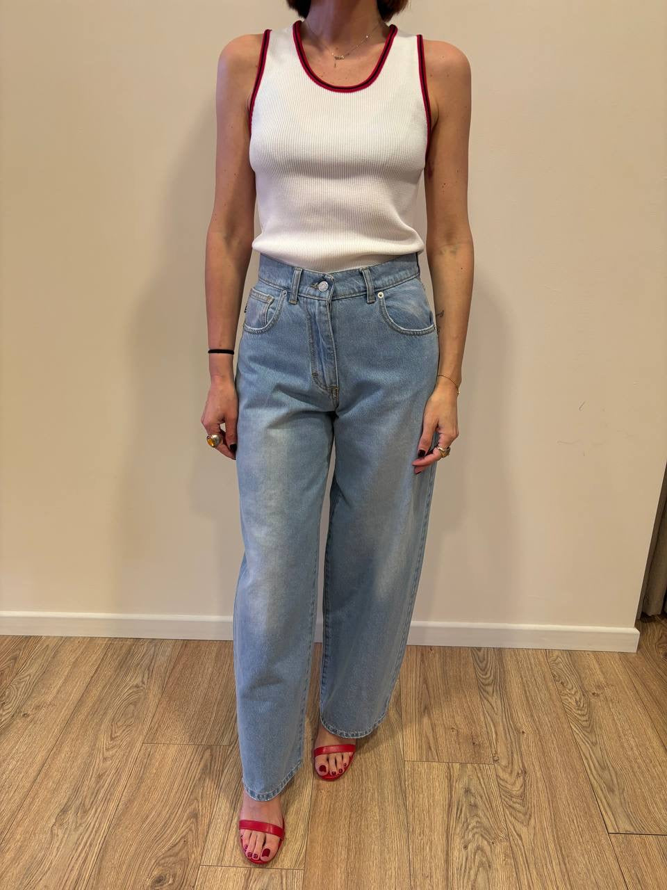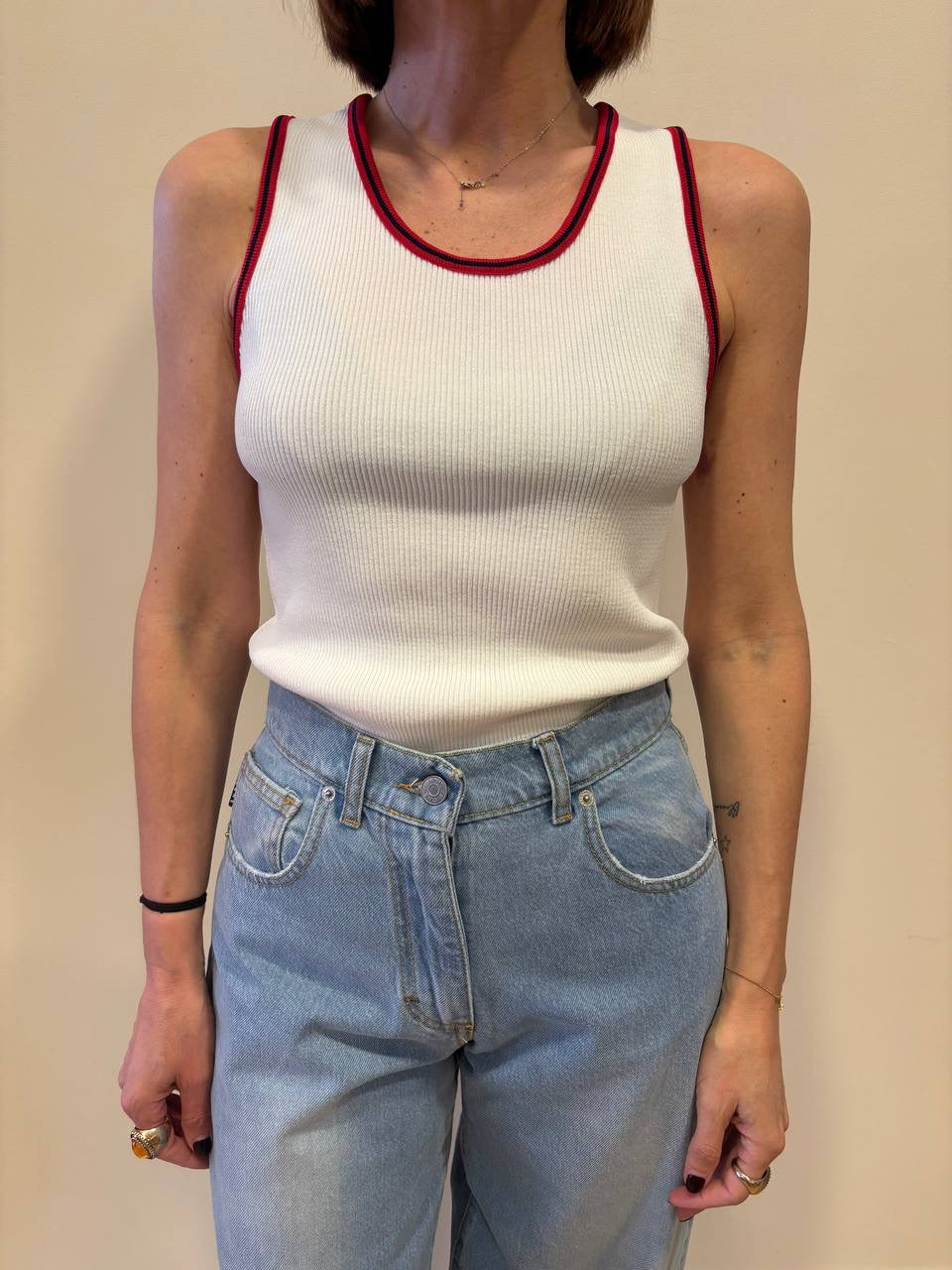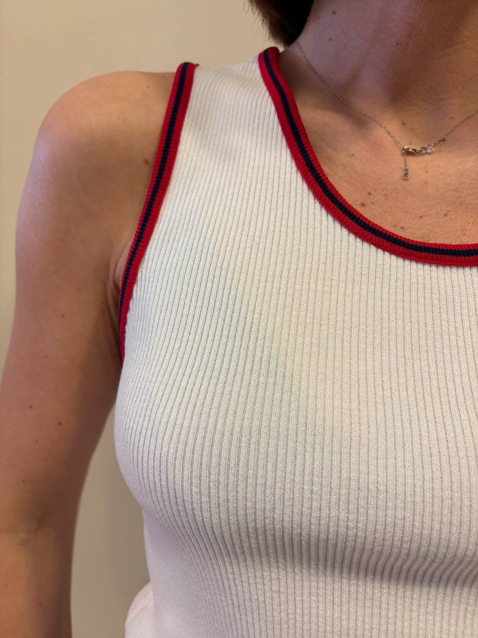 HAVEONE - Canotta a costine con profilo a contrasto. Disponibile in bianco/rosso, grigio/giallo e blu/beige.