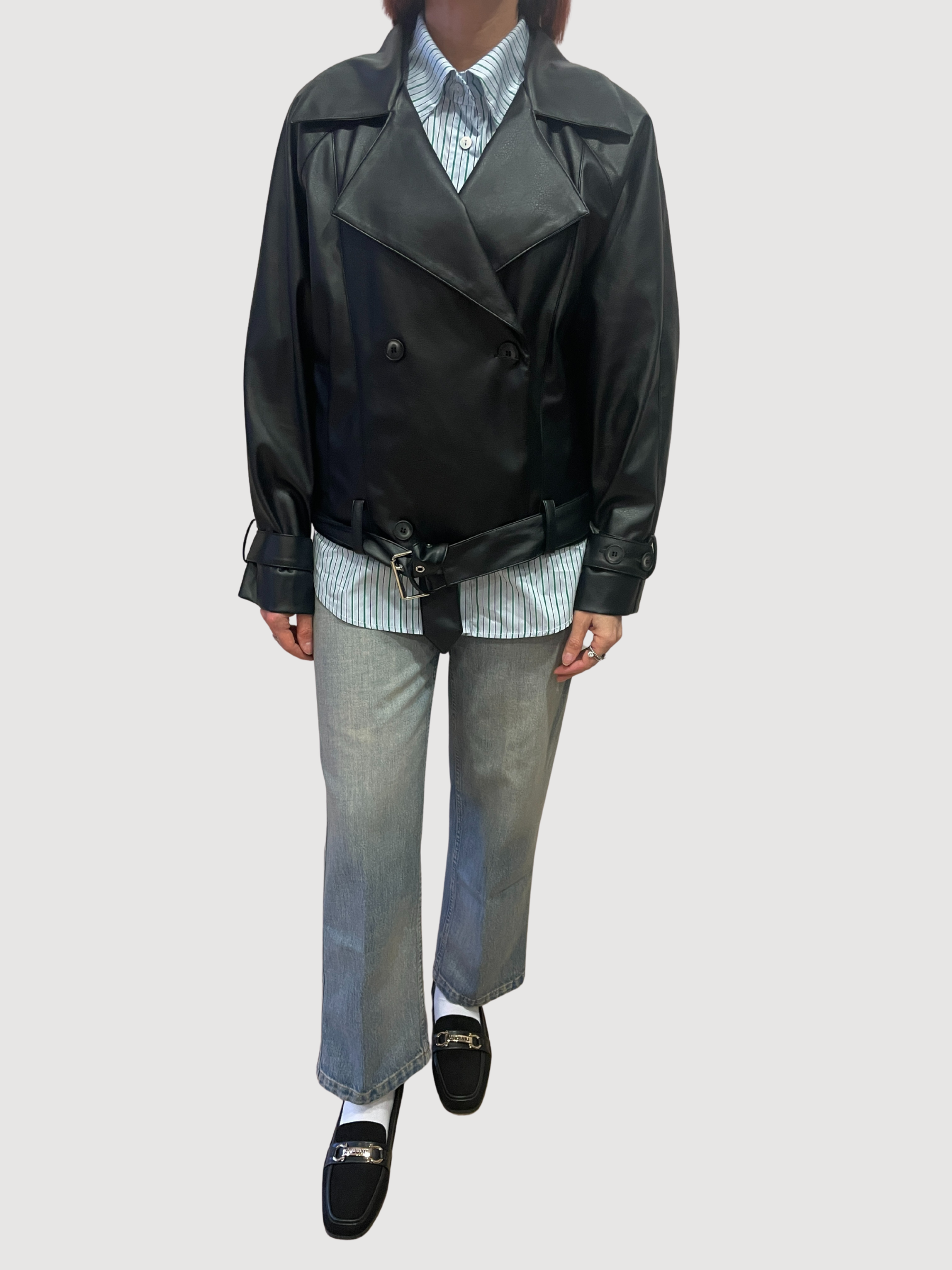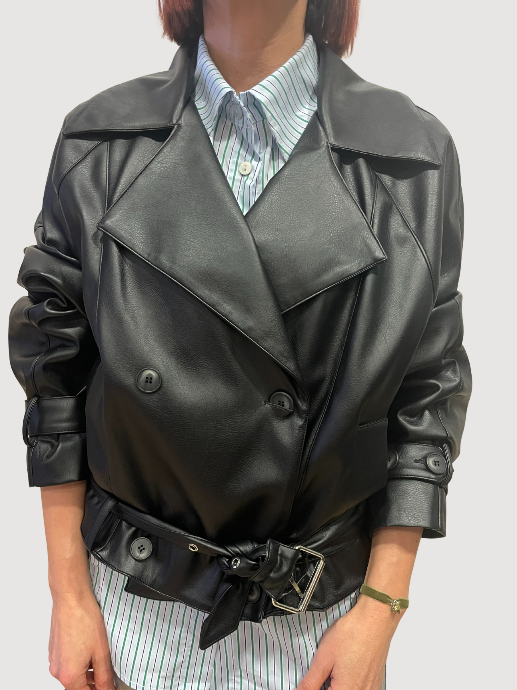 HAVEONE - Chiodo in ecopelle nero a doppiopetto con cintura.