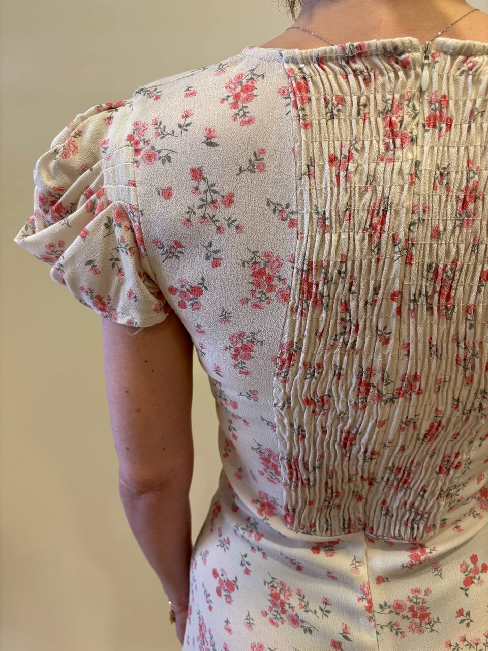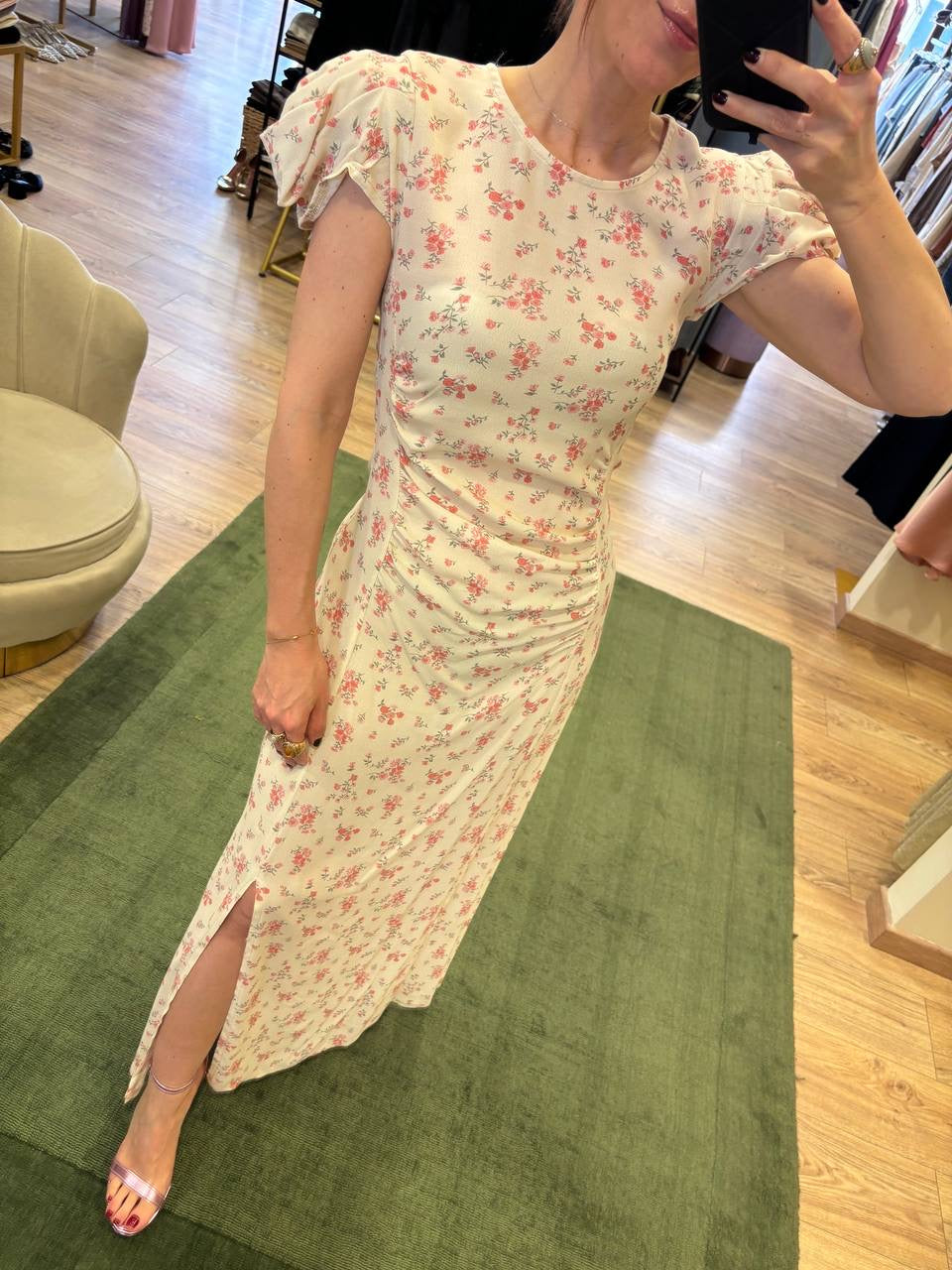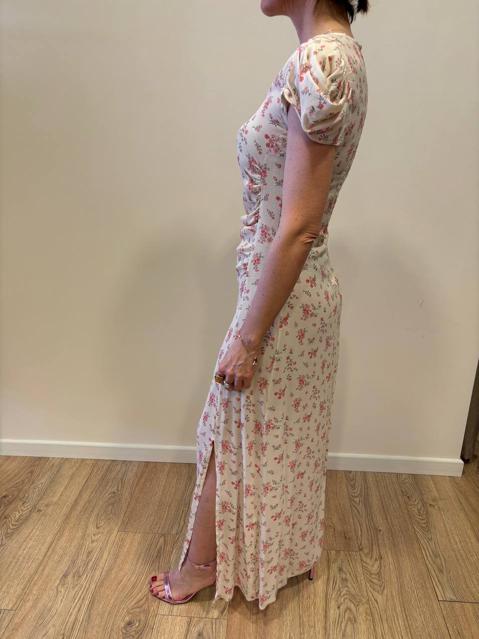 KONTATTO - Abito lungo a fiori ecrù con mezze maniche a sbuffo e arricciature. Spacco laterale e zip sul retro.