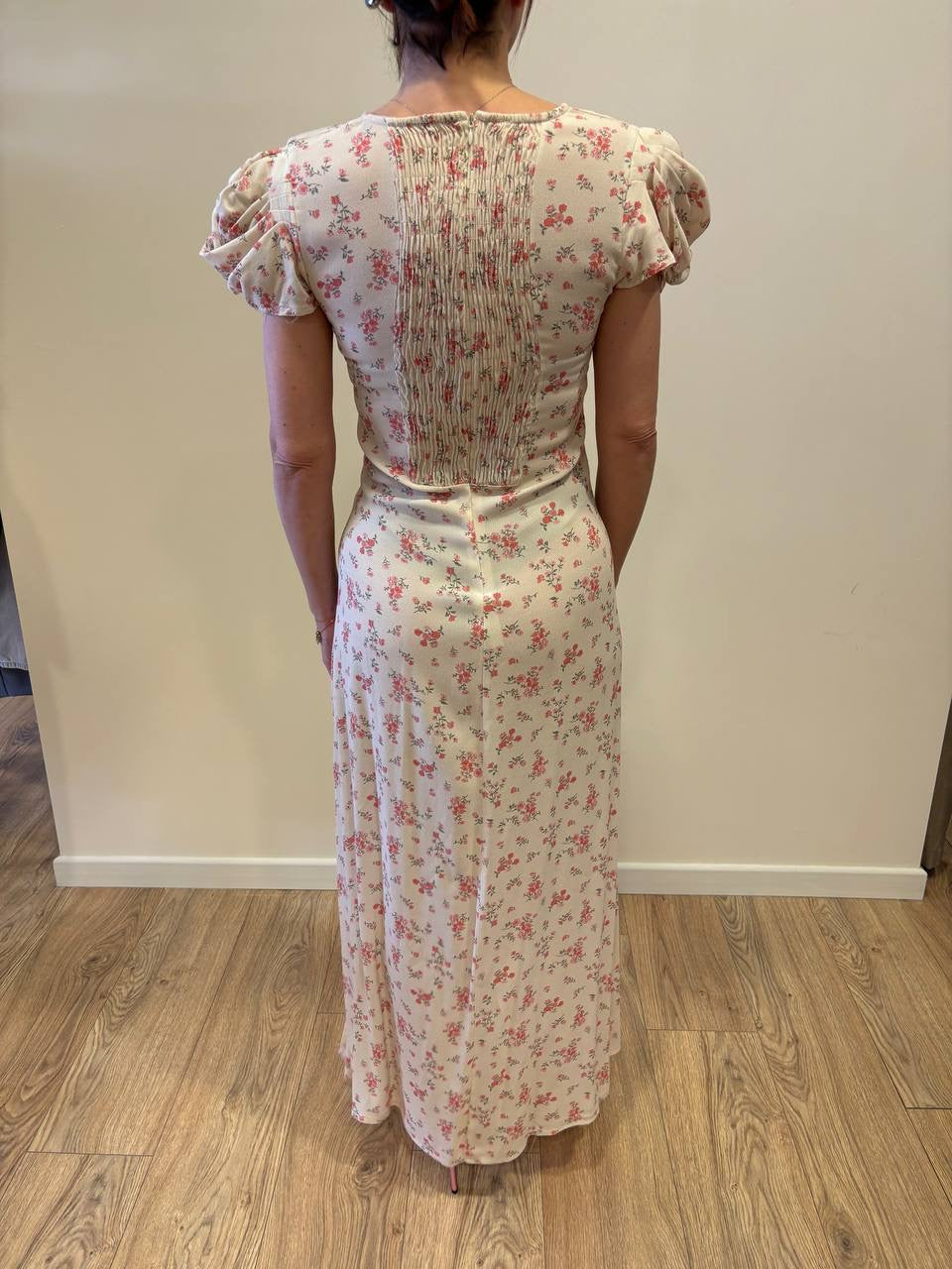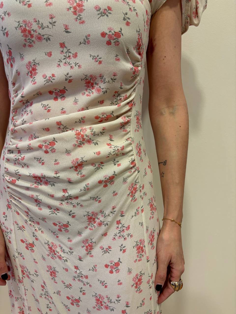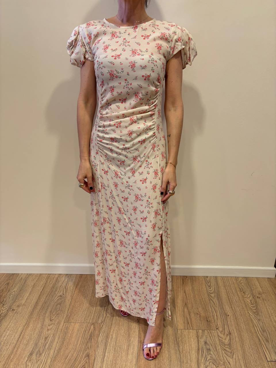 KONTATTO - Abito lungo a fiori ecrù con mezze maniche a sbuffo e arricciature. Spacco laterale e zip sul retro.