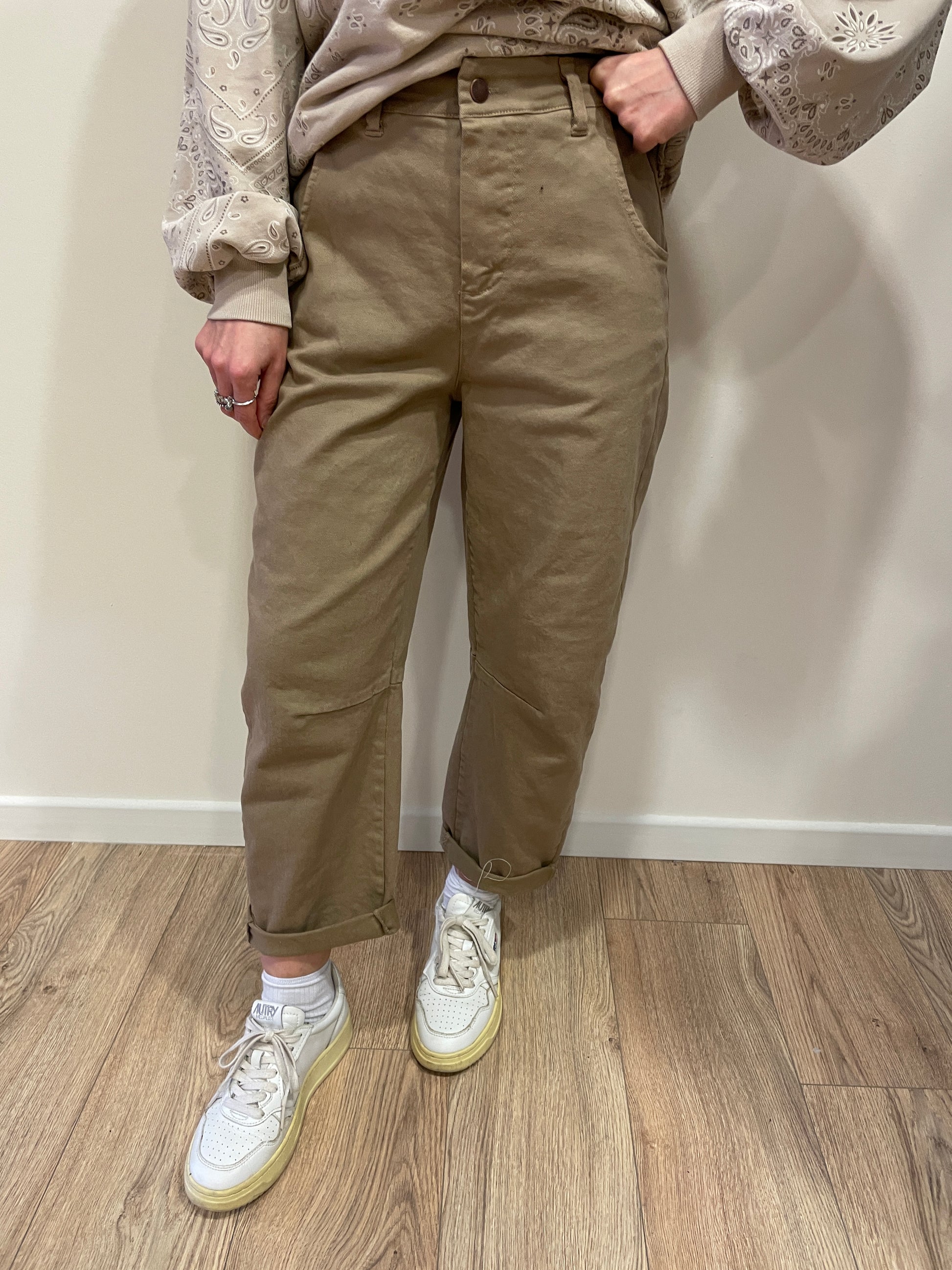Pantalone barrel fit color sabbia con elastico.