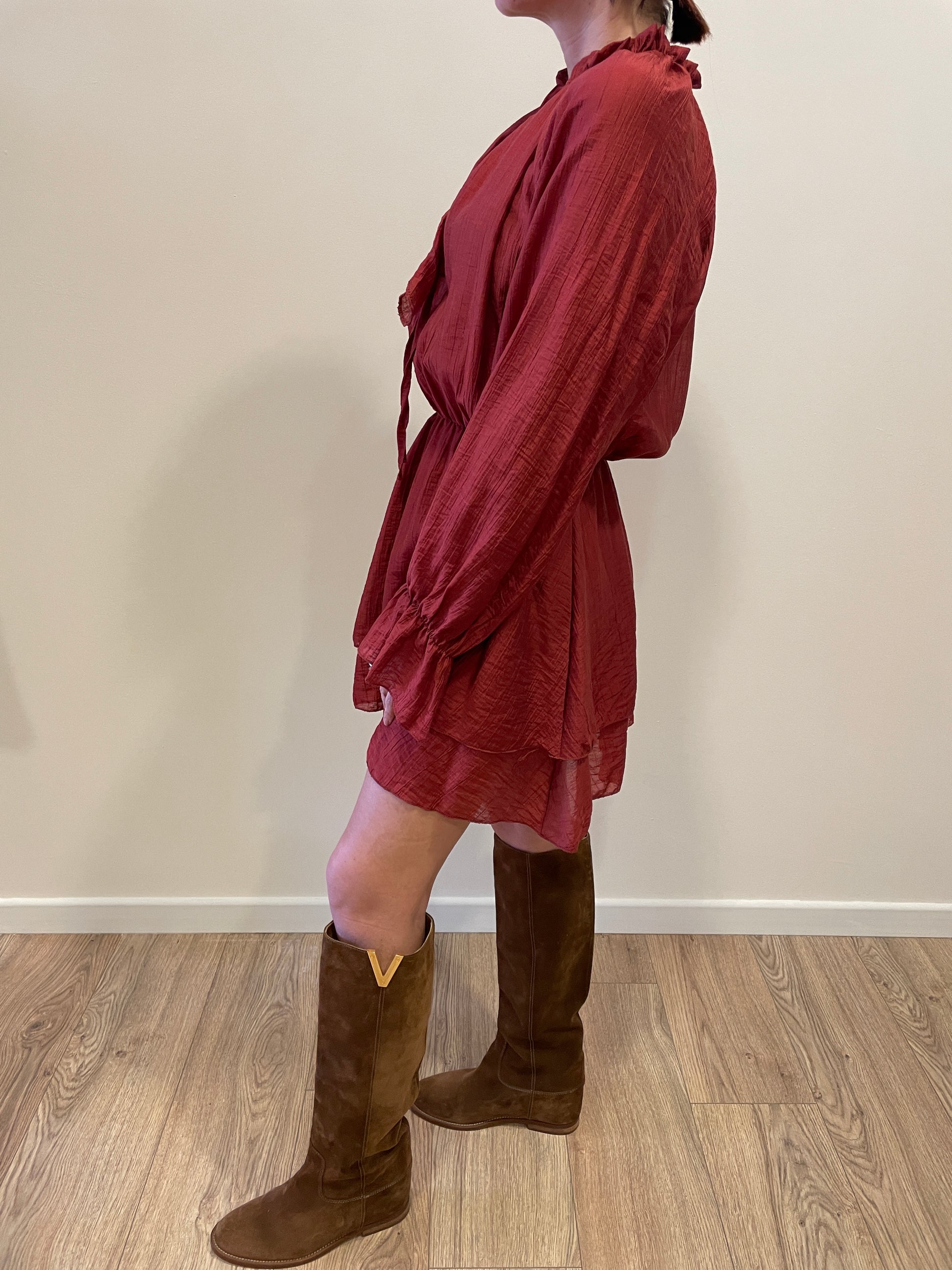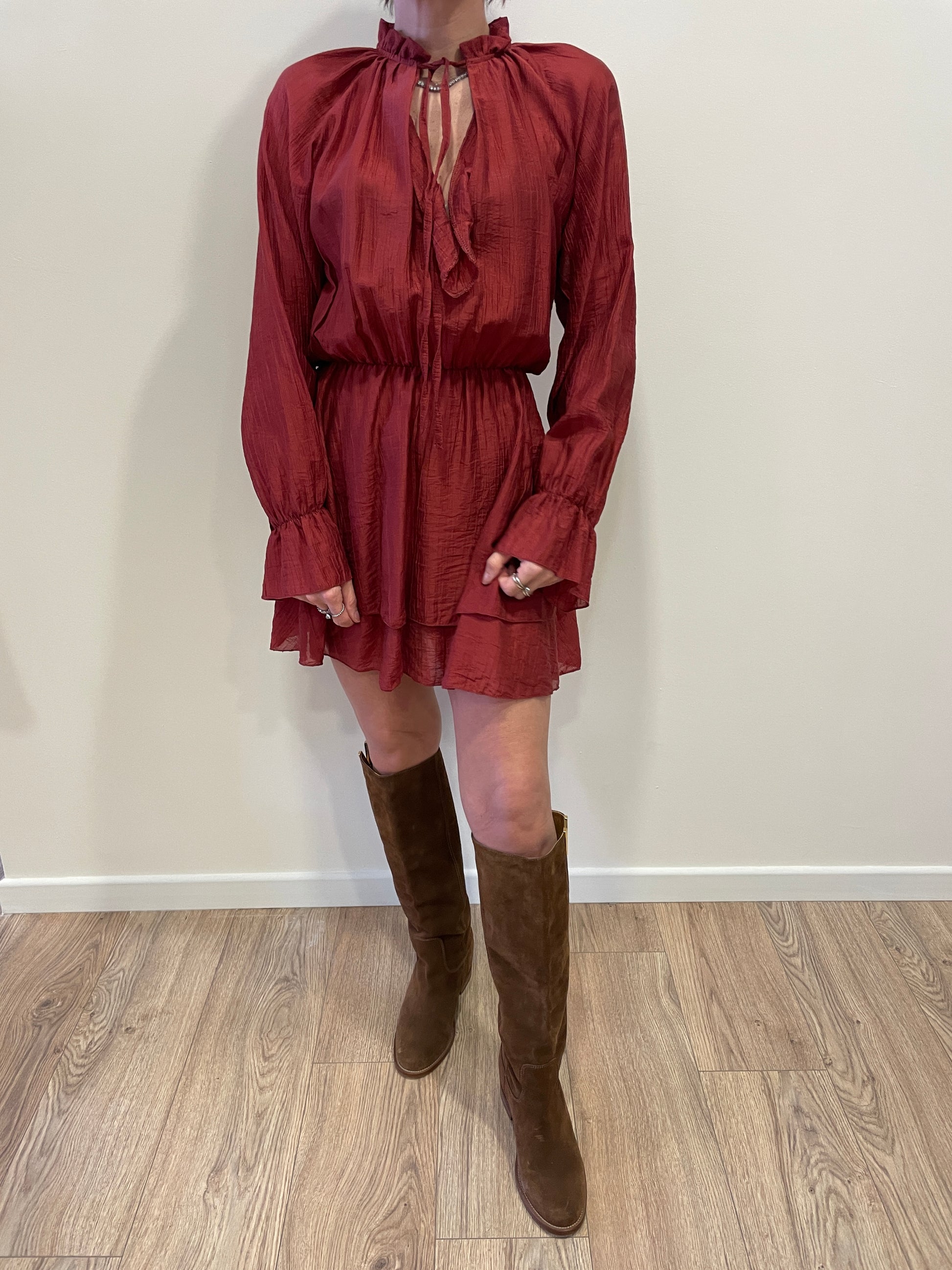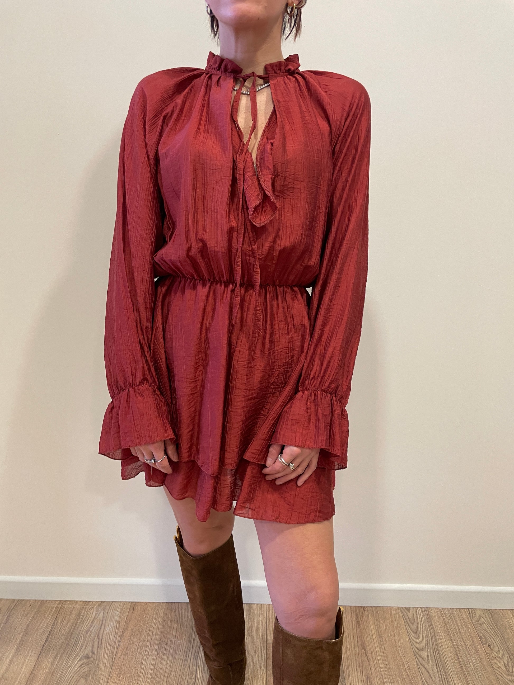 SAIPH - Abito corto color aragosta con volant e laccetto. Elastico in vita.