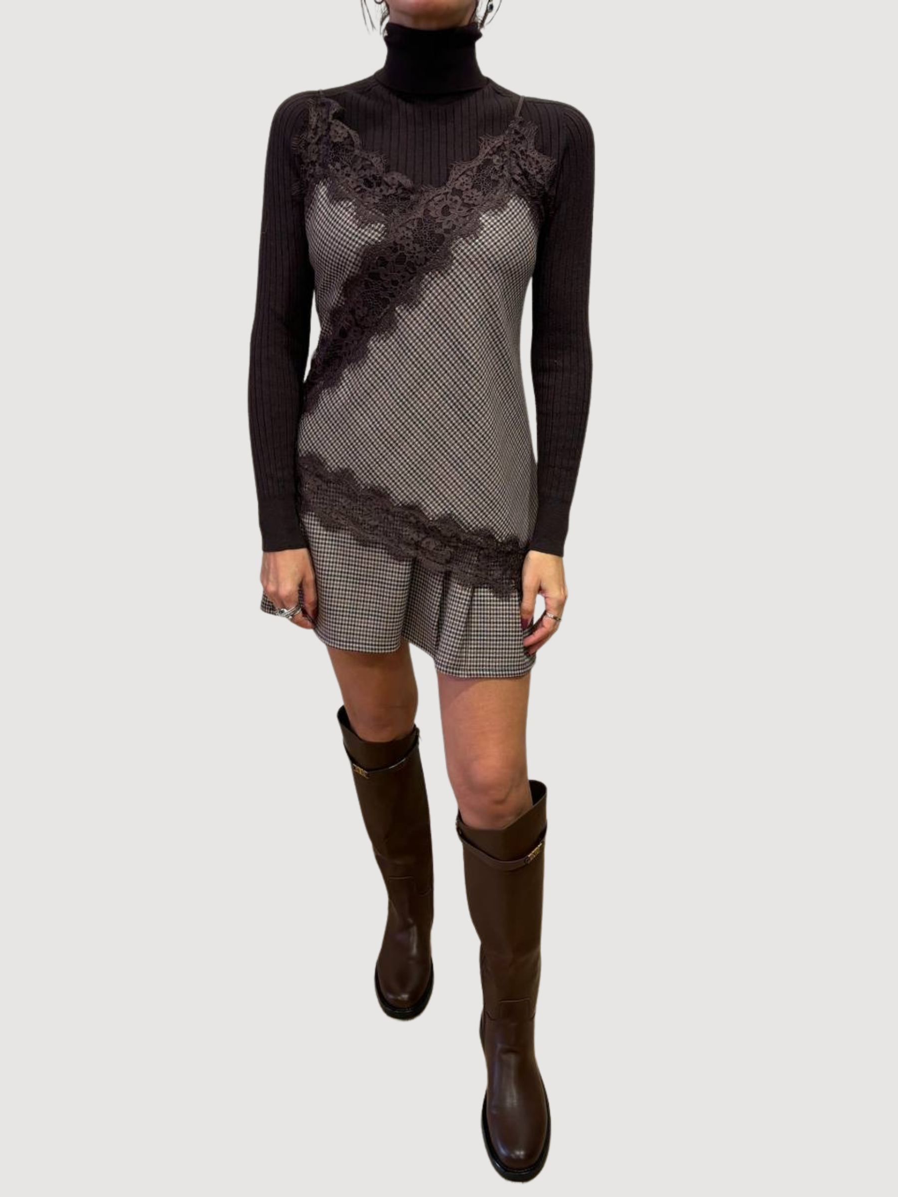 SAIPH - Top check moro asimmetrico con dettaglio pizzo.