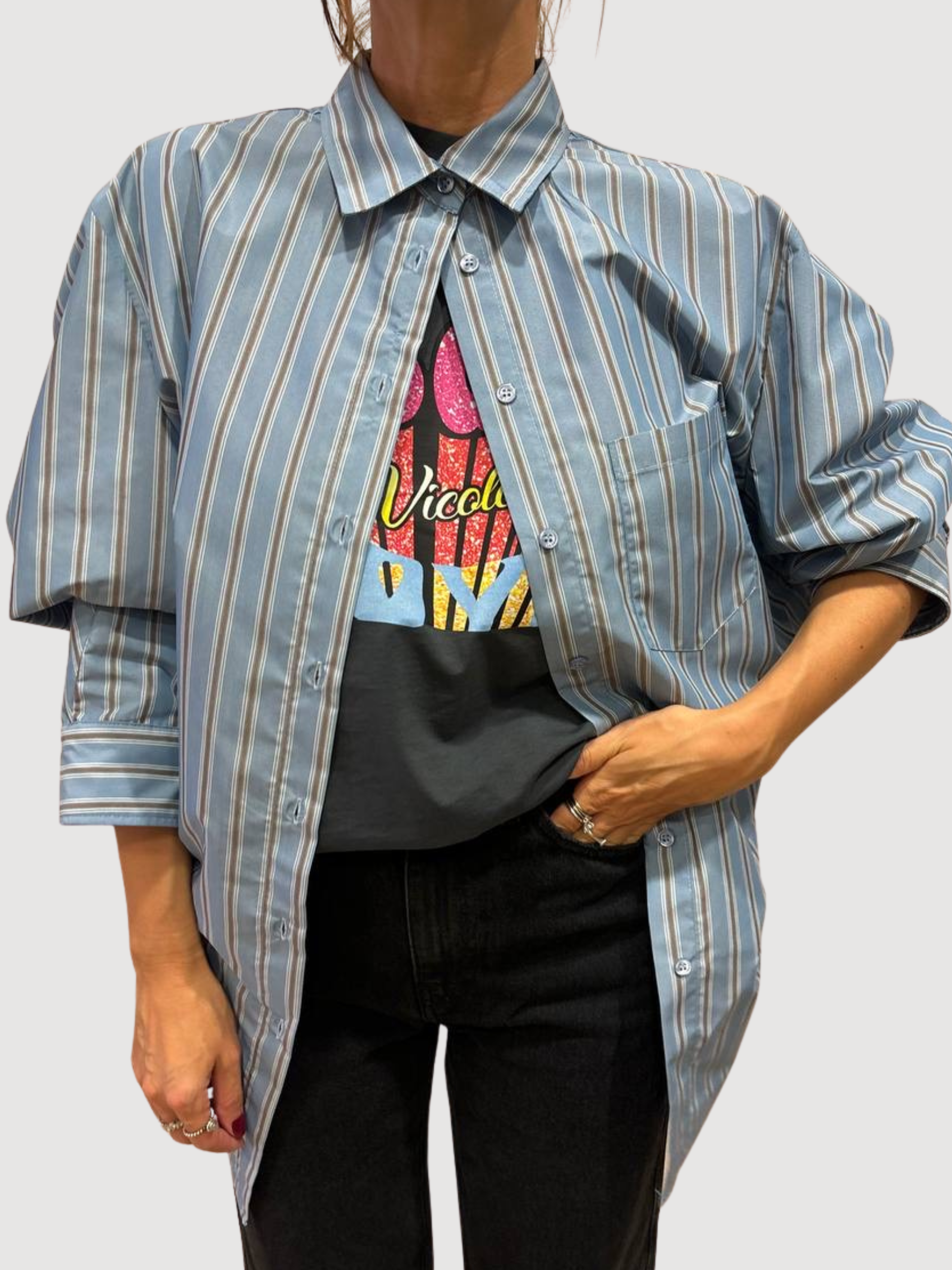 VICOLO - Camicia over azzurra a righe cioccolato.