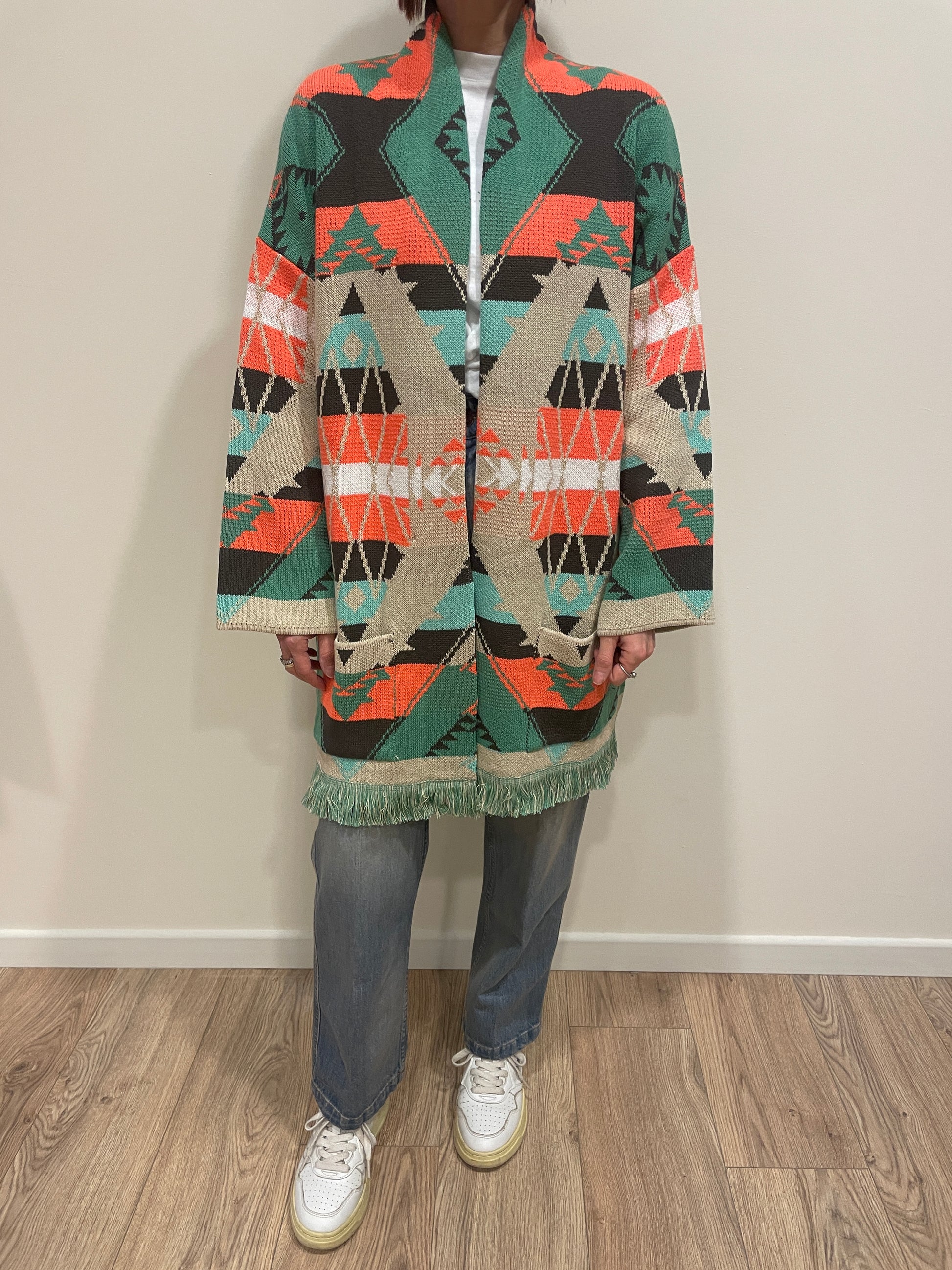 VICOLO - Cardigan in fantasia aperto con frange color bottiglia e arancio