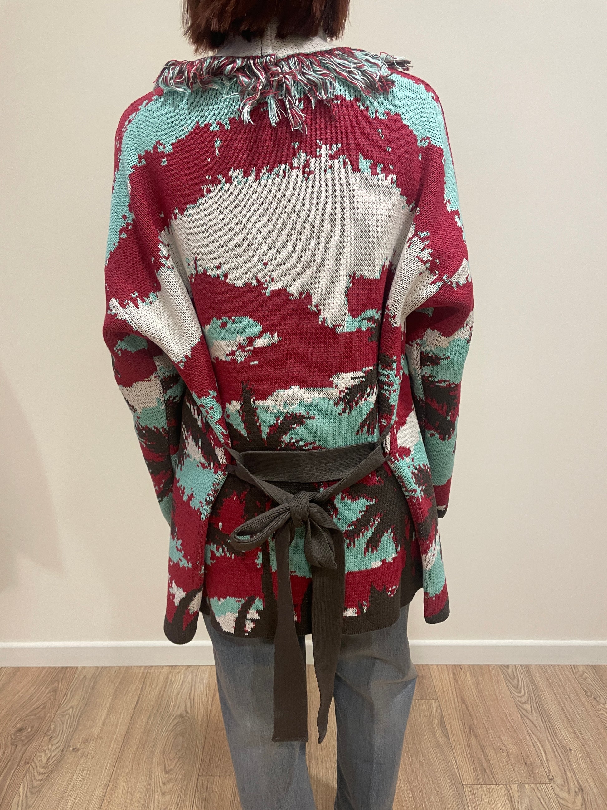 VICOLO - Cardigan in fantasia con cintura e frange rosso, turchese, moro e burro.